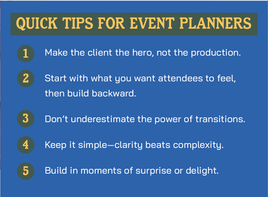 This approach also helps prevent common pitfalls. Too often, events feel disjointed, with abrupt transitions or an overload of content. By focusing on the journey, you create a sense of flow. Even the in-between moments—such as walk-ins, breaks, and transitions—are designed with intention. That keeps the energy moving forward instead of stalling.